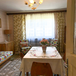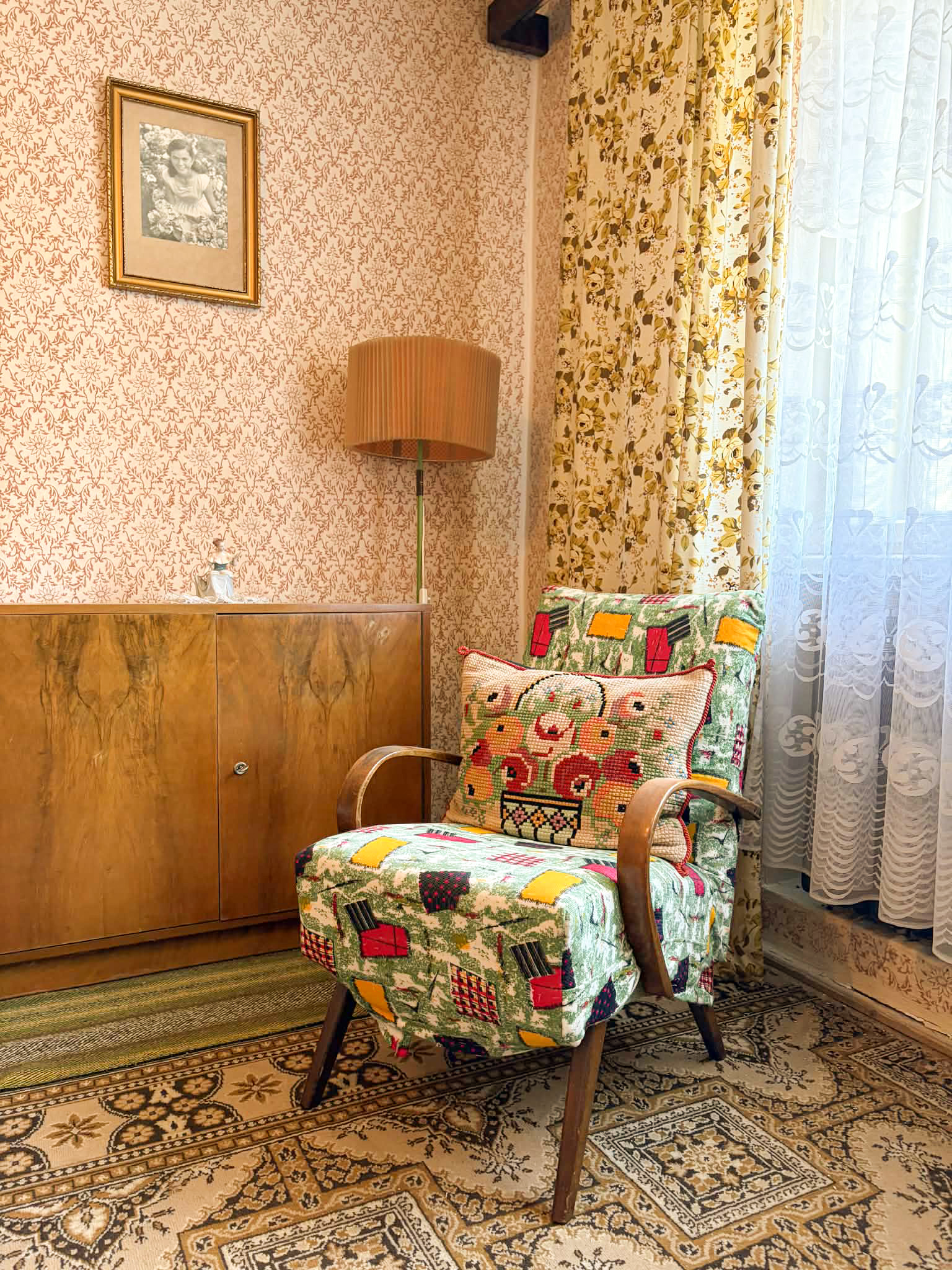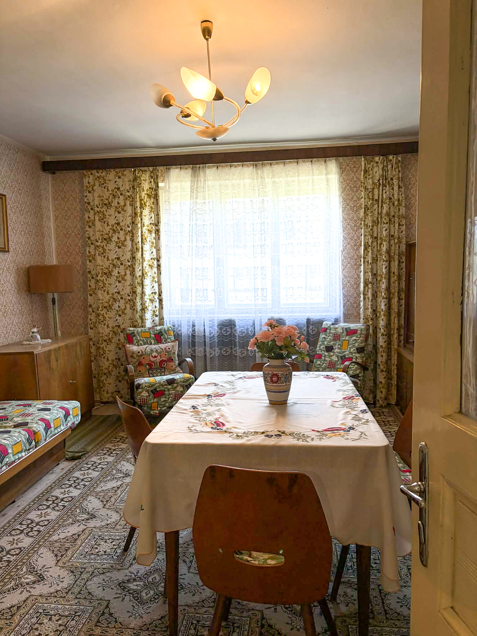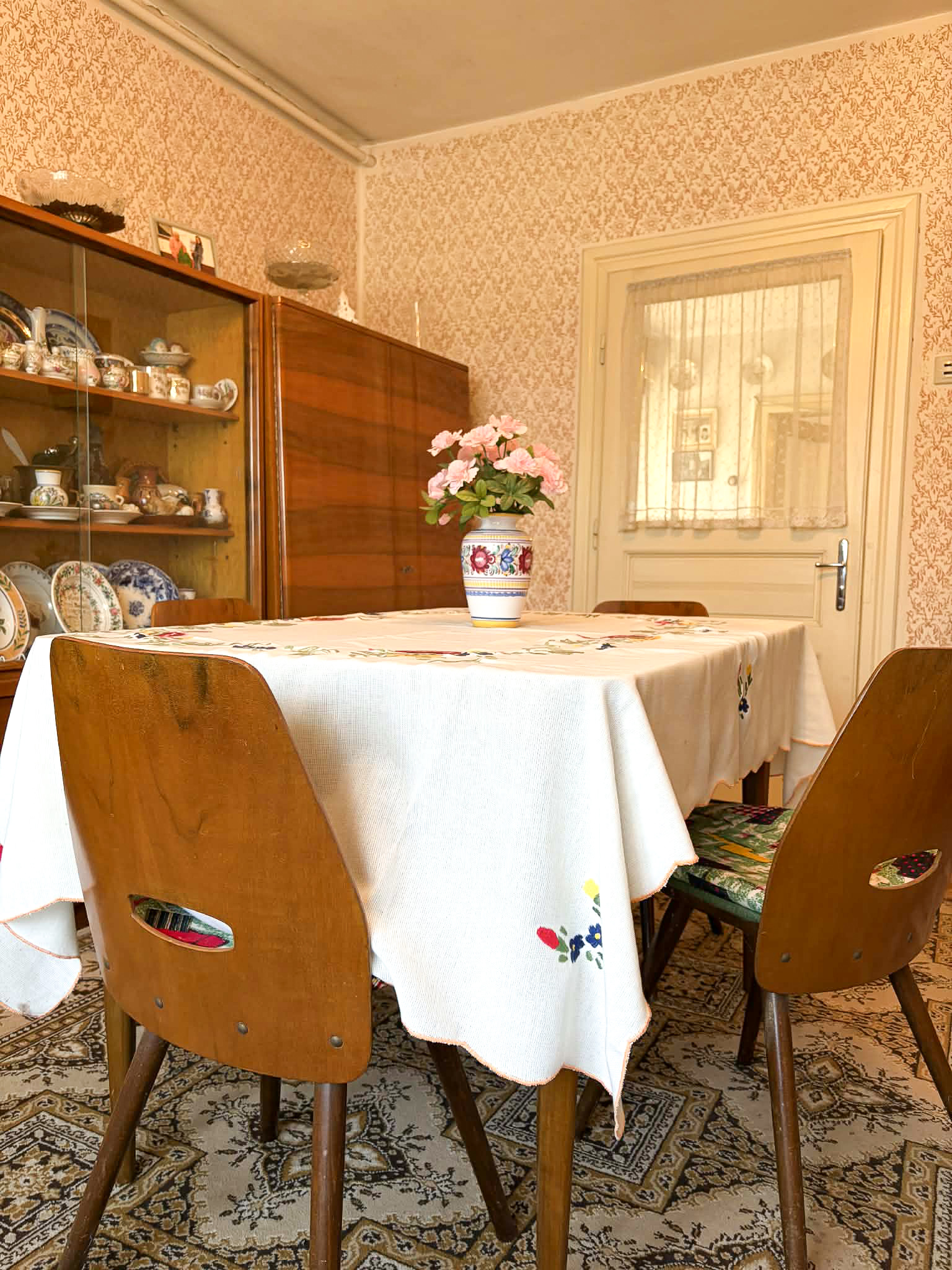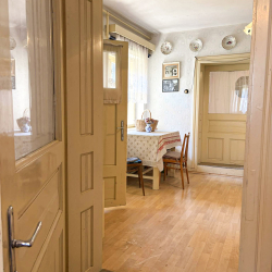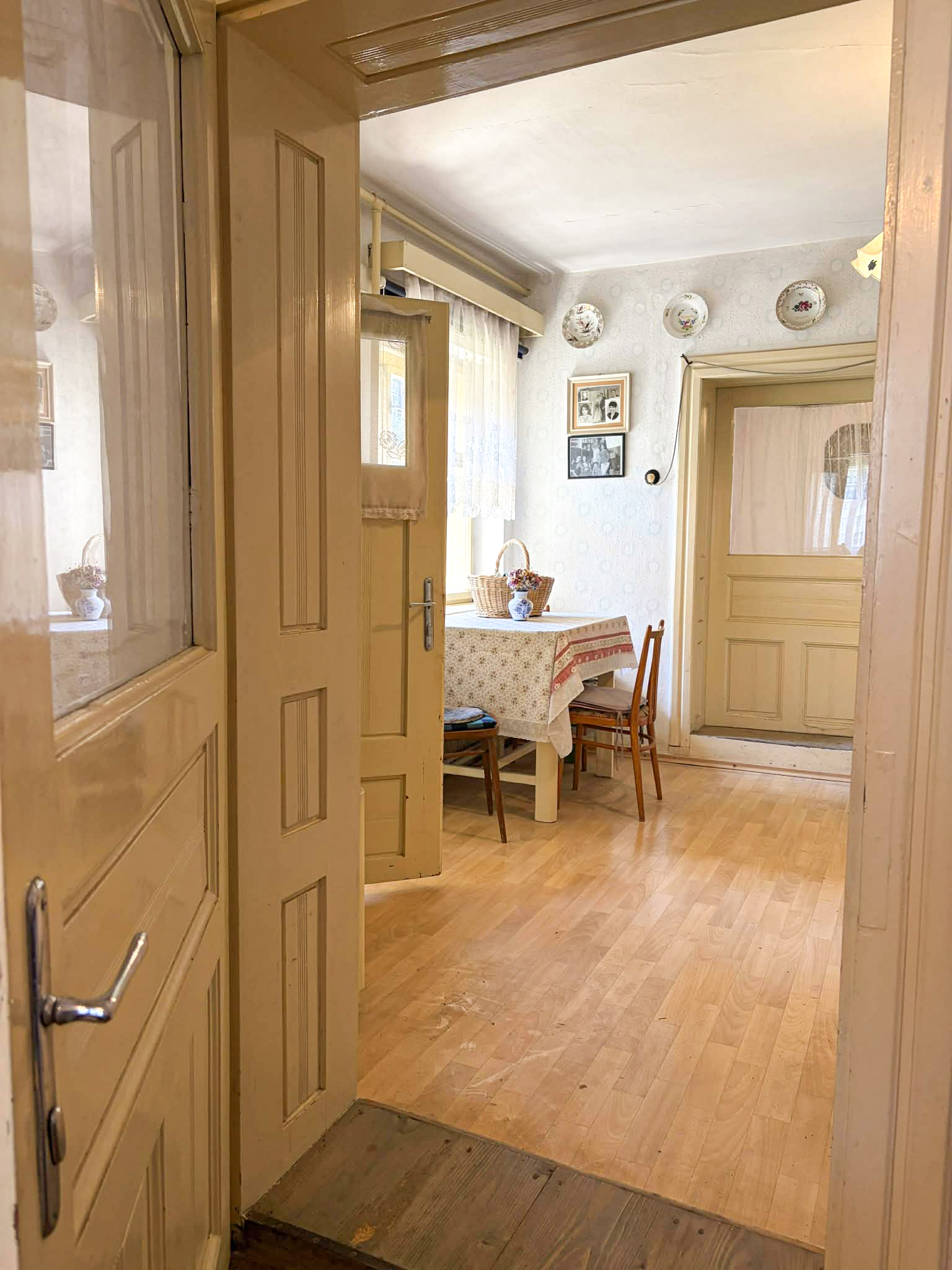 Interiér pôsobí veľmi autenticky – drevené prvky, pôvodné dvere a detaily vytvárajú atmosféru, ktorú v novostavbách nenájdete.